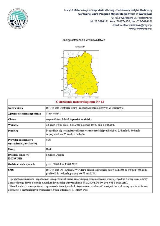 Od godz. 19:00 dnia 13.03.2020 do godz. 10:00 dnia 14.03.2020 na terenie powiatu kraśnickiego przewiduje się wystąpienie silnego wiatru o średniej prędkości od 25 km/h do 40 km/h, w porywach do 75 km/h, z zachodu.