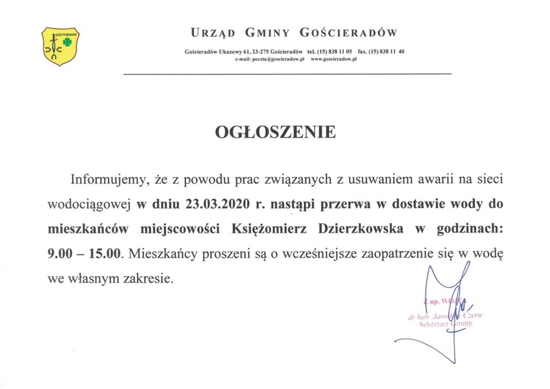 Informujemy, że z powodu prac związanych z usuwaniem awarii na sieci wodociągowej w dniu 23.03.2020 r. nastąpi przerwa w dostawie wody do mieszkańców miejscowości Księżomierz Dzierzkowska w godzinach: 9.00 — 15.00. Mieszkańcy proszeni są o wcześniejsze zaopatrzenie się w wodę we własnym zakresie.