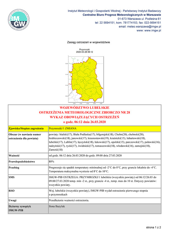 WOJEWÓDZTWO LUBELSKIE OSTRZEŻENIA METEOROLOGICZNE ZBIORCZO NR 28 WYKAZ OBOWIĄZUJĄCYCH OSTRZEŻEŃ