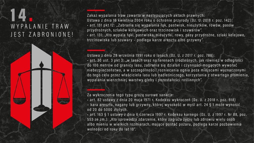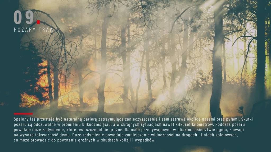 Spalony las przestaje być naturalną barierą zatrzymującą zanieczyszczenia i sam zatruwa okolicę Ozami oraz pyłami. Skutki pożaru są odczuwalne w promieniu kilkudziesięciu, a w skrajnych sytuacjach nawet kilkuset kilometrów. Podczas pożaru powstaje duże zadymienie, które jest szczególnie groźne dla osób przebywających w bliskim sąsiedztwie ognia, z uwagi na wysoką toksyczność dymu. Duże zadymienie powoduje zmniejszenie widoczności na drogach i liniach kolejowych, co może prowadzić do powstania groźnych w skutkach kolizji i wypadków.
