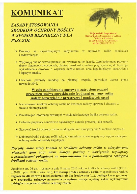 Pszczoły, które miały kontakt ze środkiem ochrony roślin w zdecydowanej większości giną poza ulem, dlatego prosimy o nawiązanie współpracy z pszczelarzami polegającej na informowaniu ich o planowanych zabiegach środkami ochrony roślin.