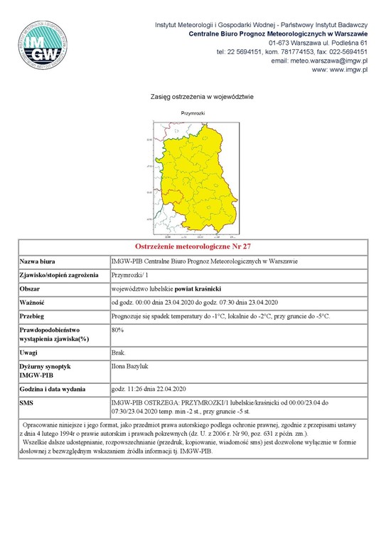 Od godz. 00:00 dnia 23.04.2020 do godz. 07:30 dnia 23.04.2020 prognozuje się spadek temperatury do -1°C, lokalnie do -2°C, przy gruncie do -5°C.