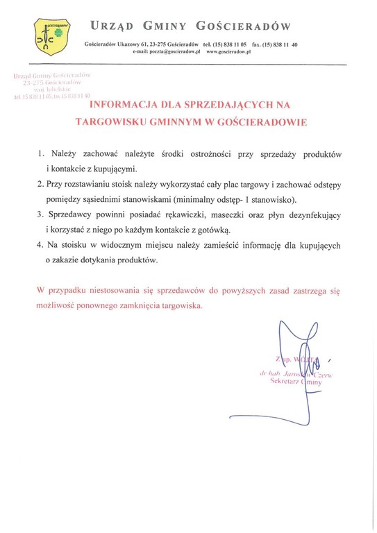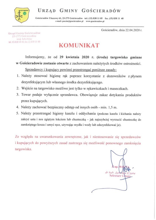 Informujemy, że od 29 kwietnia 2020 r. (środa) targowisko gminne w Gościeradowie zostanie otwarte z zachowaniem należytych środków ostrożności. Sprzedawcy i kupujący powinni przestrzegać poniższe zasady: