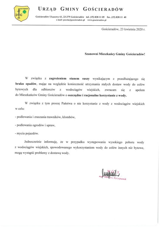 W związku z zagrożeniem stanem suszy wynikającym z przedłużającego się braku opadów, mając na względzie konieczność utrzymania stałych dostaw wody do celów bytowych dla odbiorców z wodociągów wiejskich, zwracam się z apelem do Mieszkańców Gminy Gościeradów o oszczędne i racjonalne korzystanie z wody. W związku z tym proszę Państwa o nie korzystanie z wody z wodociągów wiejskich w celu:
