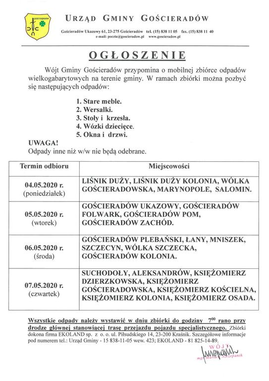Wszystkie odpady należy wystawić w dniu zbiórki do godziny 700 rano przy drodze głównej stanowiącej trasę przejazdu pojazdu specjalistycznego. Zbiórki dokona firma EKOLAND sp. z o. o. ul. Piłsudskiego 14, 23-200 Kraśnik. Szczegółowe informacje pod numerem tel.: Urząd Gminy - 15 838-11-05 wew. 423; EKOLAND - 81 825-14-89.
