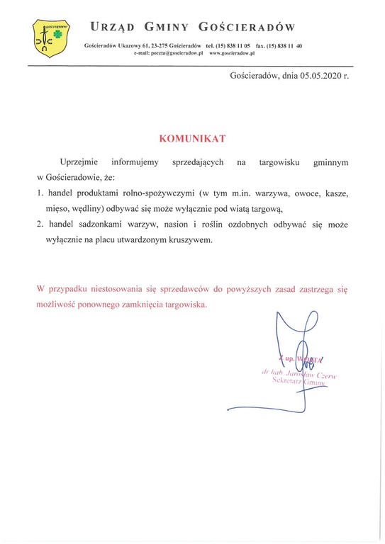 Uprzejmie informujemy sprzedających na targowisku gminnym w Gościeradowie, że: