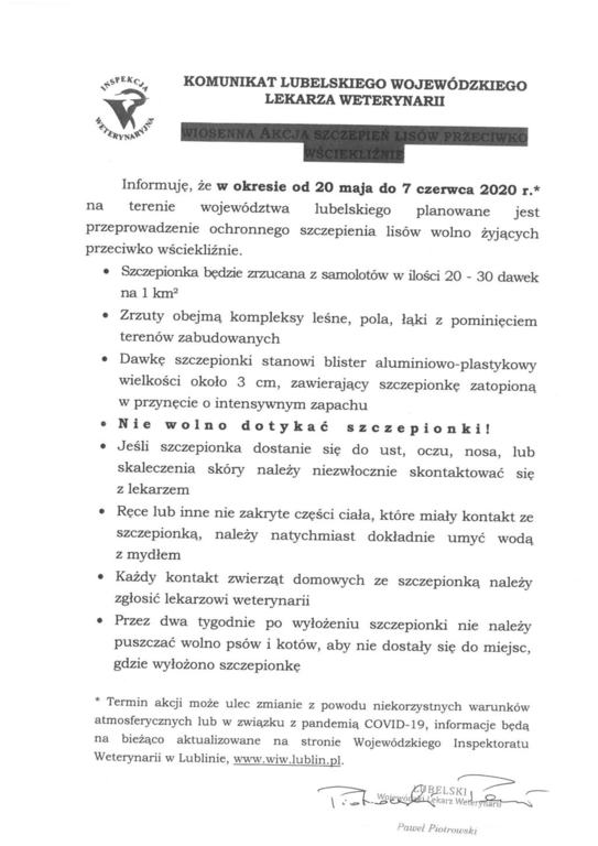 KOMUNIKAT LUBELSKIEGO WOJEWÓDZKIEGO LEKARZA WETERYNARII