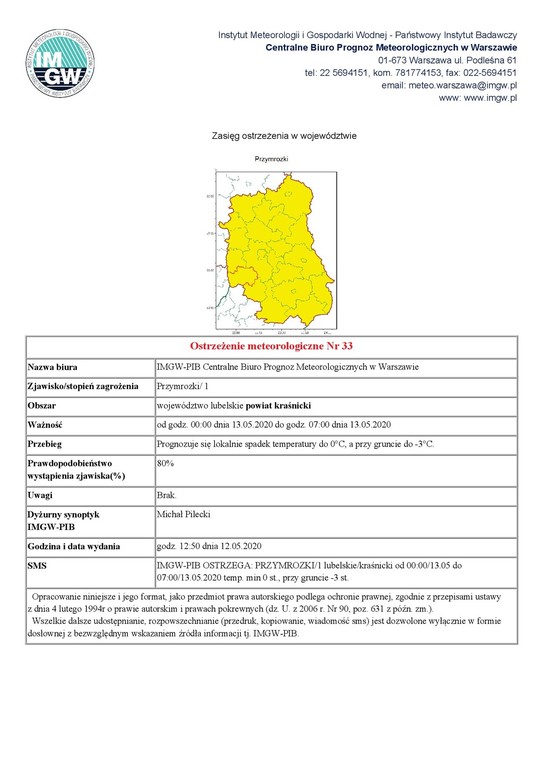 Od godz. 00:00 dnia 13.05.2020 do godz. 07:00 dnia 13.05.2020 prognozuje się lokalnie spadek temperatury do 0°C, a przy gruncie do -3°C.