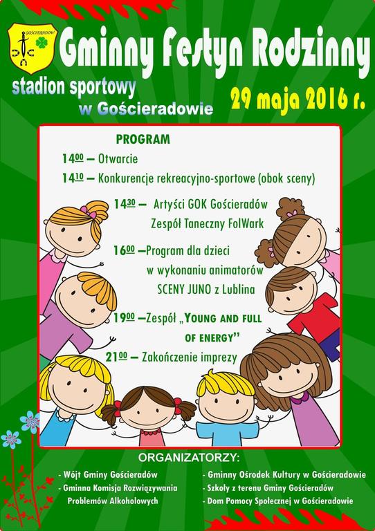 Wójt Gminy Gościeradów serdecznie zapraszaja na Gminny Festyn Rodzinny, który odbędzie sie 29 maja od godz. 14.00 na Stadionie Sportowym w Gościeradowie. Życzymy udanej zabawy!!!