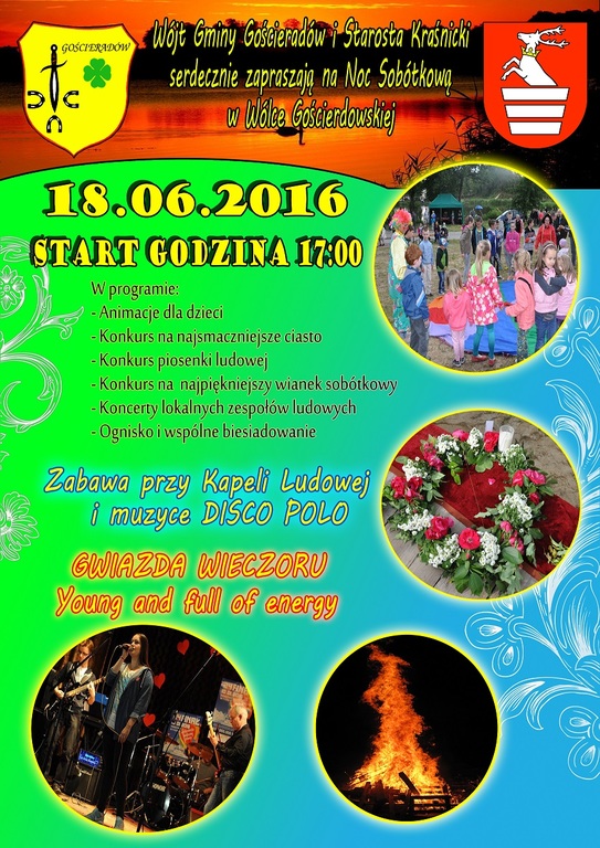 Wójt Gminy Gościeradów, Starosta Kraśnicki oraz Komitet Organizacyjny serdecznie zapraszają na „Noc Sobótkową” w najbliższą sobotę tj. 18 czerwca 2016r. o godz. 17.00 na stawach w Wólce Gościeradowskiej. Organizatorzy przewidzieli szereg konkursów i atrakcji.