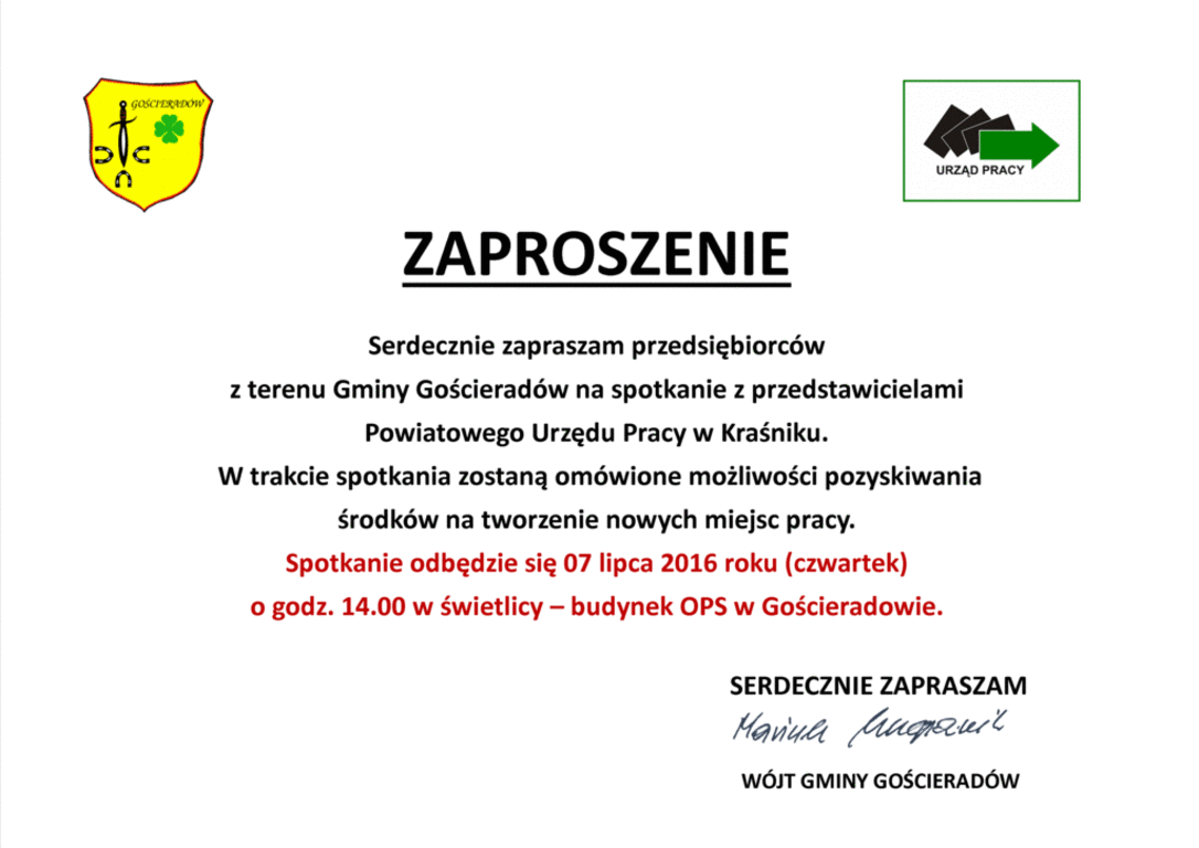 Wójt Gminy Gościeradów serdecznie zaprasza przedsiębiorców z terenu Gminy Gościeradów na spotkanie z przedstawicielami Powiatowego Urzędu Pracy w Kraśniku. W trakcie spotkania zostaną omówione możliwości pozyskiwania środków na tworzenie nowych miejsc pracy. Spotkanie odbędzie się 07 lipca 2016 roku (czwartek) o godz. 14.00 w świetlicy – budynek OPS w Gościeradowie.