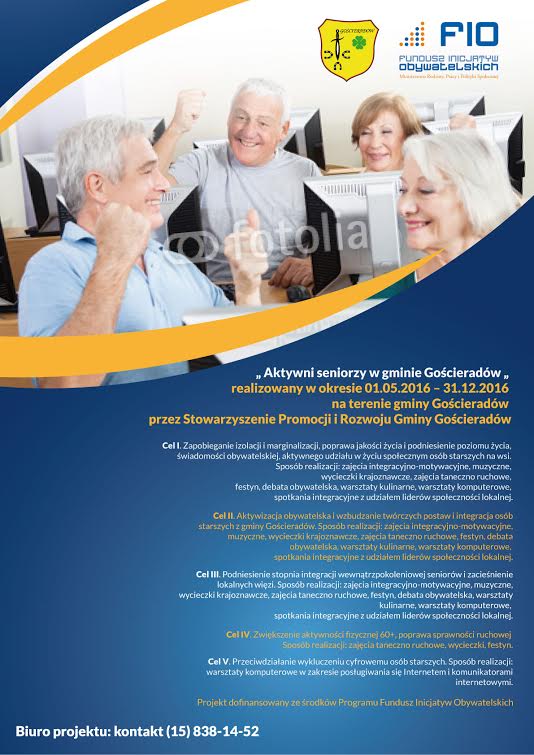 W okresie 1.05.2016 - 31.12.2016 na terenie gminy Gościeradów realizowany jest przez Stowarzyszenie Promocji i Rozwoju Gminy Gościeradów projekt "Aktywni seniorzy w Gminie Gościeradów".