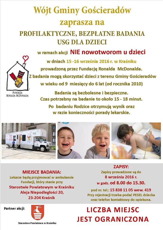 Wójt Gminy Gościeradów zaprasza na bezpłatne badania USG dzieci w wieku od 9 miesięcy do 6 lat.
